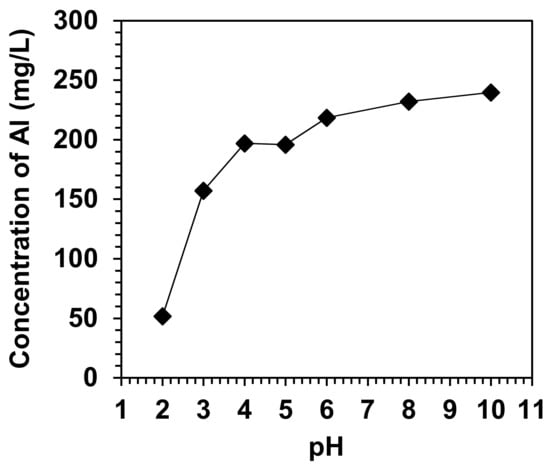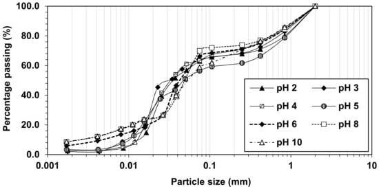 The pH of the simulated soils was adjusted to seven different values (2.0, 3.0, 4.0, 5.0, 6.0, 8.0, and 10.0) with sulfuric acid (H2SO4), sodium hydroxide (NaOH), and deionized water. The water content of each simulated soil was adjusted to 1.5–2 times the LL of the soil. Atterberg limits tests were performed on the simulated soils to evaluate the effects of pH on the physical properties of the soils. The particle-size distributions of the pH-adjusted soils were analyzed based on the ASTM D422-63 standard []; the solution pH was adjusted to different values during these tests. After filtering through a 2-μm filter, the concentration of aluminum (Al) in the test solution was measured by inductively coupled plasma-atomic emission spectroscopy (ICP-AES).