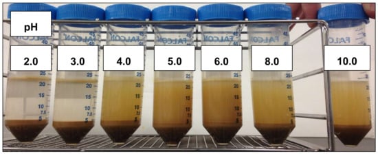 Solutions after adjusting solution pH at 2.0, 3.0, 4.0, 5.0, 6.0, 8.0, and 10.0.