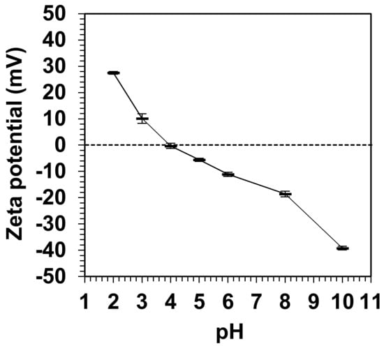 It was reported that the zeta potential of MMC showed positive values under acidic conditions as Al3+ can compress diffuse double layer []. Furthermore, in the pH range of 6.0 to 8.0–10.0, Al(OH)3 precipitate is positively charged with the absorption of positively charged AlOH2+ and Al(OH)2+ species; on the other hand, it is negatively charged due to Al(OH)4− for pH > 8.0–10.0 []. In addition, the zeta potential becomes more positive in the presence of salt cation such as Ca2+ and Mg2+ since they can compress the diffuse double layer of the minerals. They precipitate as salt hydroxide at alkaline pH values and the zeta potential becomes more positive due to precipitated covered solid []. Although the zeta potential of the simulated soils composed of 1.58% Ca and 1.46% Mg in this study (Table 2) showed different values from that of MMC in distilled water (−22.6 mV at pH 3 and −41.2 mV at pH 11) [], the changing trends of the zeta potential was in good agreement with that of the past study. Thus, in this study, the zeta potential was entirely shifted to positive direction at each pH condition due to Al, Ca, and Mg, resulting in changes of the physical properties of the simulated soils.