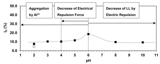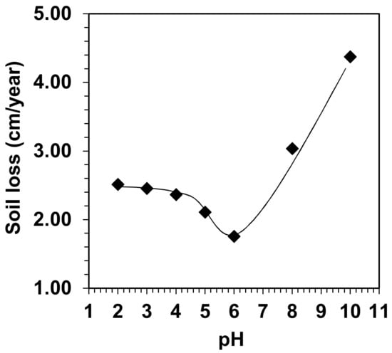 Figure 8 shows the annual rate of soil water erosion of the simulated soils at different pH, as determined in the artificial rainfall tests (the experimental data is presented as Supplementary Materials) []. The annual rate of soil water erosion decreased from 2.51 cm/year to 1.76 cm/year as pH increased from 2.0 to 6.0 and then increased up to 4.37 cm/year as pH increased further to 10.0. Based on the erosion hazard in the guideline for the district government of Aceh Barat in Indonesia, which is not site specific and can be applied to other districts [], the risk is very low when soil loss is less than 0.15 cm/year, low when it ranges from 0.15 to 0.9 cm/year, moderate when it ranges from 0.9 to 1.8 cm/year, and high when it ranges from 1.8 to 4.8 cm/year. As the measured annual erosion rates in this study were ranged within the values, the soil water erosion in the artificial rainfall test possibly occurs in the site in Indonesia. Further, the changing trends in the annual erosion rate corresponded to the changes in LL shown in Figure 3. The simulated soils were easily detached and transported by rainwater as a result of the low cohesive strength between soil particles along with the low LL and IP at the pH compared the soil at pH 6.0. The greatest erosion rate was observed at pH 10.0 because the repulsion force between negatively charged particles was maximized at this pH (Figure 7).