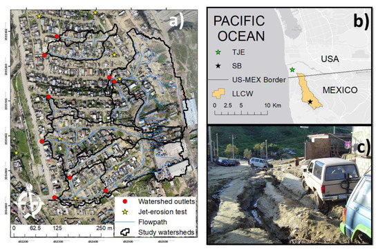 (a) UAS-SfM-derived orthophoto for San Bernardo (SB), and the 9 study watersheds with their outlets; (b) Geographic location of the Los Laureles Canyon Watershed (LLCW), SB, and the Tijuana River Estuarine Reserve (TJE); (c) one example of land degradation caused by gully erosion in Tijuana, Mexico.