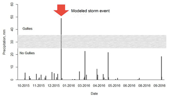 Daily rainfall time series for the 2016 water year. The grey box represents the rainfall threshold (~25–35 mm) for gully formation observed in the study area.
