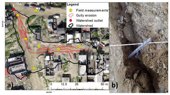 (a) Digitized gullies, watershed boundary, outlet, and locations of field measurements of gully depths; (b) An example of field measurement of gully depth.