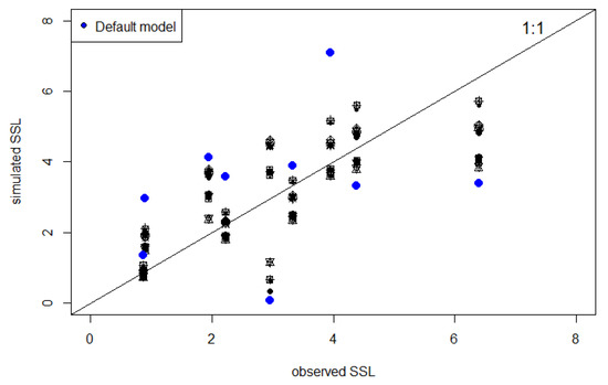 Relationship between observed and simulated Specific Soil Loss (SSL, the average depth of soil loss in the watershed in mm) from gully erosion in San Bernardo, Tijuana, Mexico, obtained from 21 behavioural models. The blue dots show the results from the default model parameters (Table 1).