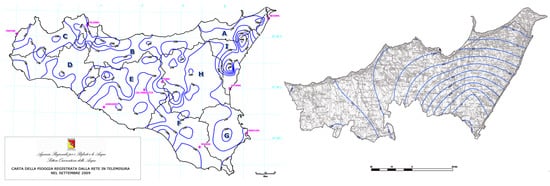 The average monthly rainfall record in Sicily in the period 2008–2009, compared to the long-term data, is higher than the average reference value in the period 1921–2005 (Figure 3C,D). Therefore the flood event in October 2009 can be considered as exceptional. The values of the isohyets in September 2009 indicate the province of Messina as the territory most affected by rainfall (Figure 4).