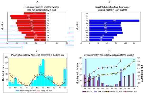 (A) The cumulative deviation from the average long-term rainfall record in Sicily in 2008–2009. (B) Rainfall in Sicily in 2008–2009 compared to the long-term data; (C) Monthly rainfall in mm compared to the long-term data. (D) Average monthly rainfall in Sicily compared to the long-term data [19].