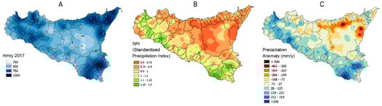 (A) Precipitation 2017 (mm/year); (B) standard Precipitation Index classes; (C) Precipitation anomaly (mm/year).