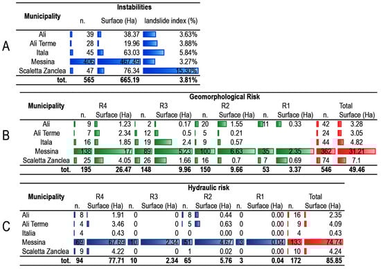 Synthesis of the entity and extension of instabilities and risk in each of the municipalities of the damaged area: (A) Instabilities (landslide index is a percentage than the whole municipality territorial area); (B) Geomorphological Risk; (C) Hydraulic Risk.