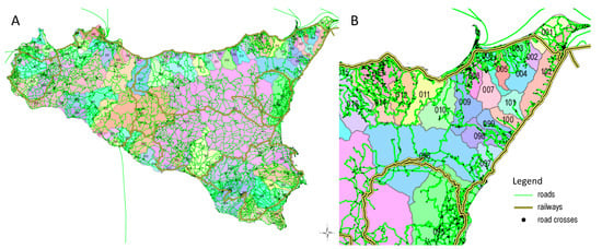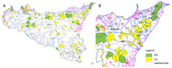 According to the Civil Protection Department data, in some of the damaged areas, the rainfall record is 220/230 in 3–4 h. The cumulative deviation from the average long-term rainfall record in Sicily in 2008 was negative (Figure 3A), while the one in 2009 was positive (Figure 3B).