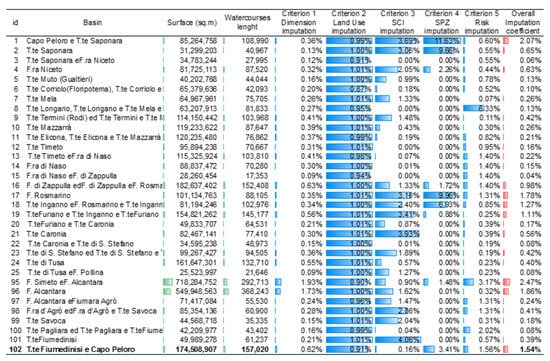 - As mentioned in Section 3.4, the relative importance of each river basin, measured by imputation coefficient , formula (4), can be assumed to drive the public expense to the best allocation in view of the territory vulnerability reduction; such coefficient has been calculated according to the above-mentioned five criteria (Section 4.2) to which specific weights have been attributed;