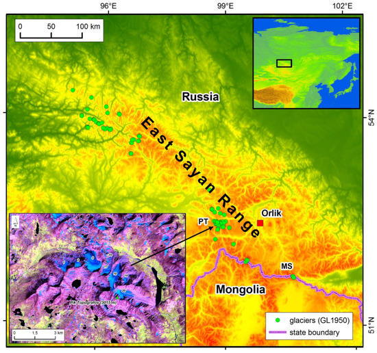 Study area (East Sayan Range) with glaciers and used Landsat scenes. Referenced glaciers (of the GI1950) are depicted by non-scale symbols. SRTM (~90 m resolution) is used as a background. Upper right inset shows the location of the East Sayan Range in Asia. MS is Munku-Sardyk, and PT is Pik Topografov. Lower left inset shows the Pik Topografov massif and studied glaciers (Landsat ETM+ image of 9 August 2001 is as background). The glacier numbers correspond to those in the GI1950 [7].
