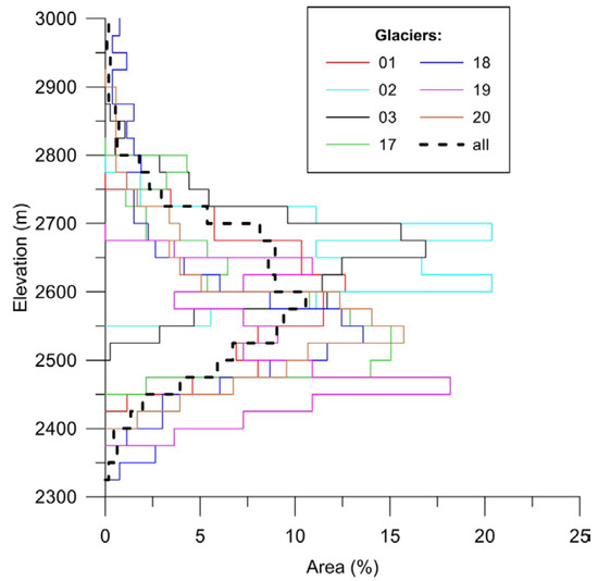 Area-elevation distribution for the studied glaciers in 2001. The area values were calculated for 25 m altitude intervals.