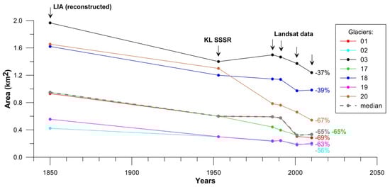 Absolute area changes from the end of the Little Ice Age to 2010 for seven studied glaciers and a median glacier. Number of glaciers corresponds to those referred in Figure 1. The percentages show the relative ice change since the Little Ice Age (LIA). “KL SSSR” means the data of the Catalogue of glaciers of the USSR [7].