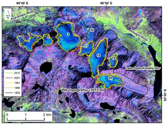 Ice area changes between 1850 and 2010 are shown in Figure 3, and spatial changes of glacier extents in Figure 4. Between 1850 and 2010, the total ice area of the seven glaciers decreased from 8.103 to 3.772 km2 (−4.331 km2, 53%, 0.33% year−1) and median glacier area decreased by 65% (0.41% year−1). Areas of individual glaciers shrank by 0.239 to 1.111 km2 (from 37 to 69%, or from 0.23 to 0.43% year−1). Glacier termini retreated by 0.4–1.4 km (median value is 0.6 km). The area reduction rate changed over the period of 1850–2010. The dynamics of glaciers between the mid-19th century and 1950s are poorly known due to a lack of mapping data, but the average area reduction is estimated at 30% (0.29% year−1). Between the mid-1950s and the early 1980s, the areas of glaciers changed slightly or moderately (with the exception of glacier No. 20). During that period, the total ice area decreased by 0.761 km2 (13%, 0.40% year−1). Our results suggest that accelerated ice area reduction occurred in the 1990s. From 1991 to 2001, the total ice area decreased by 0.815 km2 (17%, 1.69 year−1). During that time, all glacier termini retreated by 16–323 m (median value is 69 m, 7 m year−1) and individual glaciers shrank by 0.045–0.270 km2 (6–47%, 0.65–4.69% year−1). The median glacier shrank by 0.254 km2 (44%, 4.41% year−1), which is almost twice as fast as over the period of 1986–2010 (1.83% year−1). Between 2001 and 2010, the total ice area decreased by 0.237 km2 (6%, 0.66% year−1). Three glaciers (No. 17, 18 and 19) increased their area by 1–13%, and the median glacier area increased by 4% (0.41% year−1). The calculated area change in 2000s does not exceed the accepted maximum error (±10%) and seems to be rather insignificant, which probably suggests glacier stabilization.
