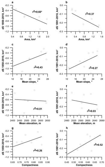 Relationships (linear regression) between absolute and relative ice area changes (dS) in 1850–2010 and 1991–2010 and initial area (a,b), mean slope (c,d), mean elevation (e,f) and compactness (g,h) of glaciers. The statistically significant relationship (p < 0.05) is indicated by an asterisk.