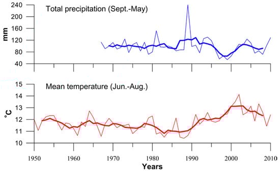Regional time series of total winter (September–May) precipitation and summer (June–August) temperature recorded at the nearest Orlik weather station (for location see Figure 1). The thick line shows the 5-year moving average.