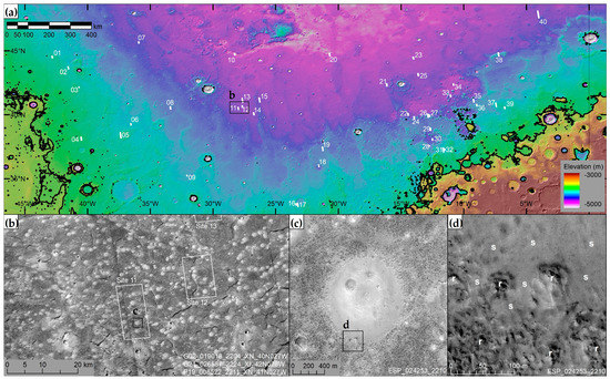 (a) MOLA gridded elevation overlain on MOLA hillshade background (128 pixels per degree) of northern Chryse–southern Acidalia region. The black lines are a −3760 m-contour approximating the Deuteronilus shoreline [2,11]. White-filled numbered rectangles represent the locations of digital elevation models (DEMs) generated in this study (Site 01 to 40, listed in Table 1). (b) Part of a mosaic of Mars Reconnaissance Orbiter (MRO) Context Camera (CTX) images [53], showing the central part of southern Acidalia Planitia. Pitted mounds appear as bright, circular features on the polygonally fractured terrain [17]. Sunlight illuminates the scene from the left. (c) A typical example of a pitted mound. Part of High Resolution Imaging Science Experiment (HiRISE) image ESP_024253_2210. Image credit: NASA/JPL/UA (University of Arizona). North is at the top. (d) Close-up view of the boundary between the mound and the surrounding plains in Figure 2c. Smooth mound materials (labeled as ‘s’) appear to overlie the surrounding terrain with relatively rough surfaces (labeled as ‘r’).