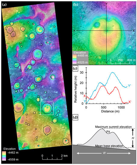 We calculated both the height H and basal width W for manually delineated individual mounds (e.g., Figure 3; Supplementary Figures S1 to S40) in each DEM. To provide accurate measurements of each pitted mound, mounds lacking a summit pit, degraded mounds, fully coalesced mounds forming complex topographies, and mounds including invalid DEM pixels have been carefully excluded from our measurements. H is defined as the difference between the maximum summit elevation and average base elevation [73,74] (Figure 3d), and W is the diameter of a circle having the same area as that of an outlined mound area [74,75].
