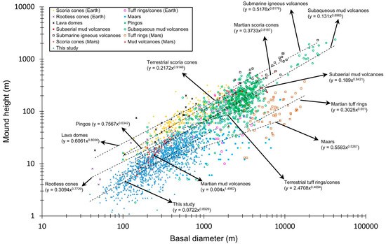 Log-log plot showing the measured maximum height (H) versus basal diameter (W) for 1297 pitted mounds in southern Acidalia Planitia (see also Table S1) and analogous features on Earth and Mars [22,76]. The dashed lines represent the best-fit power regression.