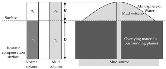 Schematic diagram of a simple buoyancy model of mud volcano formation [83]. D: isostatic compensation depth to the top of the mud source (i.e., thickness of overburden above mud source), ρm: bulk density of erupted mud through conduit, ρs: bulk density of overlying materials, ρa: bulk density of ambient materials.
