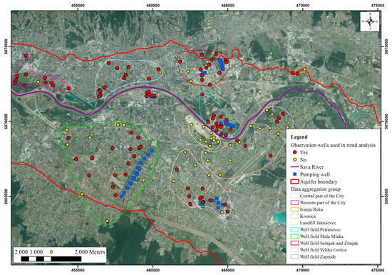 After trend analysis was done for each observation well, three additional trend calculations were established, primarily associated with spatial data aggregation. In the fifth step, trend analysis was conducted for each group of observation wells (Figure 2), mostly from the well field’s inflow areas.