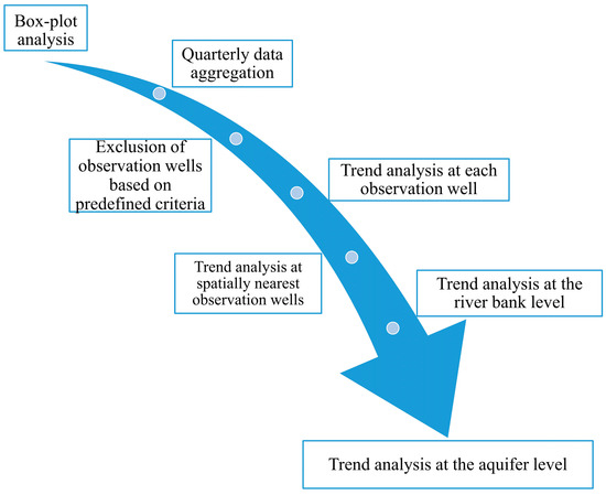 In the sixth step, trend analysis was separately conducted on the observation wells located on the left and the right Sava River bank, while in the seventh step, trend analysis was performed for the whole aquifer. Therefore, the results and generated conclusions could be compared at four different levels, i.e., observational scales of trend estimation.