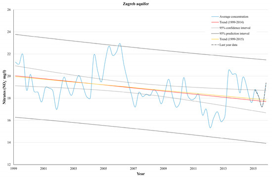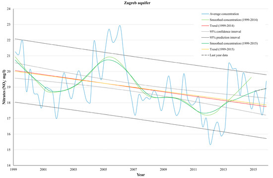 When evaluating trend lines that exceed estimated confidence intervals, and data that exceeds estimated prediction intervals in the spatially aggregated data, the results point to different conclusions. Even though data without smoothing generated trend lines within estimated confidence intervals, evaluation of last year’s data and estimated prediction intervals showed a lot more deviations. When evaluating smoothed data, in 50% of cases the data appeared outside of the estimated prediction intervals, while 33% of last year’s data is noticed outside of predicted intervals when using not smoothed data. The exception is seen for the whole aquifer, where results suggest that last year’s data did not have that much influence on trend estimation and data prediction. The very likely explanation is that high and low nitrate concentrations measured in the last year are spatially well balanced and deviations from general trend cannot be seen when all data are aggregated together. That is consistent with the fact that there are two major areas with elevated nitrate concentrations [6,7], one located on the left, and the other located on the right bank of the Sava River.