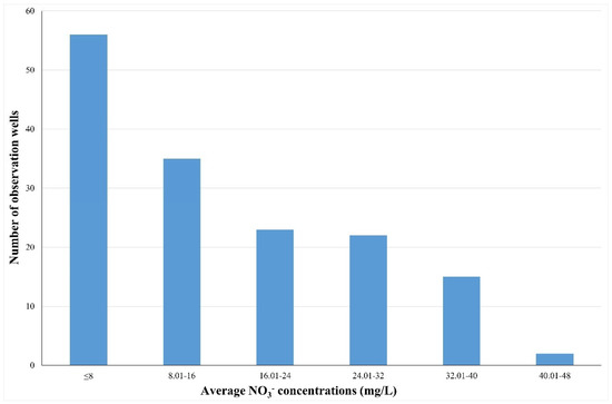 Average nitrate concentrations are lower than 16 mg/L of NO3− in 91 observation wells (Figure 8). Most of these observation wells are located in the hyporheic zone of the Sava River and have similar concentrations as those measured in the Sava River. The highest average nitrate concentration is about 44 mg/L of NO3− and is located in the urban part of the City of Zagreb, while average nitrate concentrations higher than 32 mg/L of NO3− are observed in 17 observation wells.