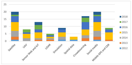 In this section, we endeavor to review the major big data sources—especially the emerging ones —for disaster management, including satellite imagery, aerial imagery and videos from unmanned aerial vehicles (UAVs), sensor web and Internet of Things (IoT), airborne and terrestrial Light Detection and Ranging (LiDAR), simulation, spatial data, crowdsourcing, social media, and mobile GPS and Call Data Records (CDR). Figure 2 illustrates the distribution of reviewed articles by different data sources and their year of publication. It can be observed that an increase in article numbers is shown in almost all types of major data sources during 2014–2016, when the topic “big data” is popular in “disaster management”, and a decrease in 2017. Satellite imagery, crowdsourcing, and social media data serve as the most popular data for disaster management.