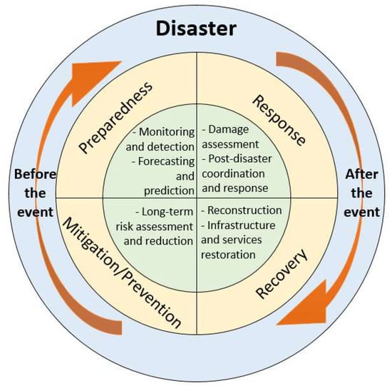The disaster management cycle is a continuous process involving different phases of planning and preparing for expected disasters, including long-term mitigation (i.e., “mitigation/prevention”); short-term preparation and prevention (i.e., “preparedness”); reducing impacts of a disaster through response and rescue efforts (i.e., “response”); and restoration through clean-up and reconstruction (i.e., “recovery”) [89]. In this section, we classify the 149 articles into the four phases and review the “mitigation/prevention” phase in two aspects: (1) long-term risk assessment and reduction; and (2) forecasting and prediction; the “preparedness” phase in two aspects: (1) monitoring and detection, and (2) early warning; two aspects for the “response” phase: (1) damage assessment; and (2) post-disaster coordination and response; and the post-disaster “recovery” phase (Figure 3).
