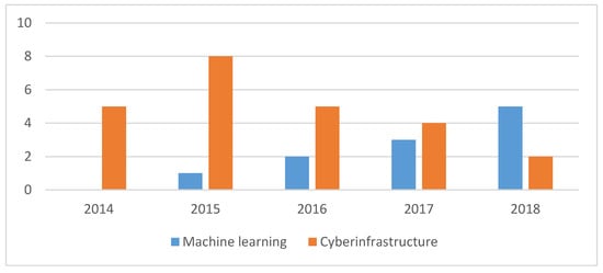 Distribution of the reviewed article with subtopic “machine learning” and “cyberinfrastructure” respectively over the recent years.
