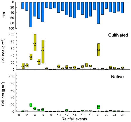 Rainfall events lower than 30 mm did not show significant differences in soil loss (the mean value of each event) for the two types of pastures, however, the mean value was three times higher for the exotic pasture (native 1.0 g m−2 vs. exotic 3.0 g m−2). However, rainfall events higher than 30 mm showed significant differences between native and exotic pastures, reaching 4.4 g m−2 and 18.1 g m−2, respectively.