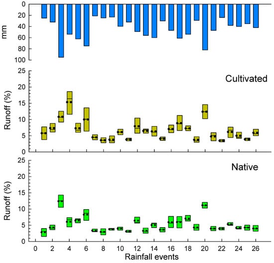 A total number of 26 rainfall events were recorded during the studied period totaling an annual rainfall amount of 1177 mm from 1 July 2015 to 30 June 2016. Soil losses and runoff are depicted in box plots per rainfall event (Figure 3 and Figure 4) and total results are summarized in the Table 2. Some rainfall events (<24 mm) did not cause significant differences in water losses among both plots. The total water losses are significantly higher in the exotic pastures (88.6 L m−2) than in the native ones (71.8 L m−2), which mean an average of 6.6% and 5.2% for the runoff coefficients, respectively. These results show a statistical significance (p < 0.036) for the total average runoff per rainfall event.