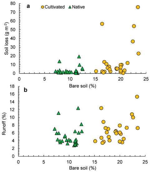 Scatterplots of bare soil, soil losses (a), and runoff (b) in cultivated and native pastures.