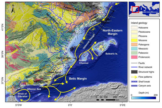 The Betic margin extends from Cape La Nao in the eastern Iberian Peninsula to the Strait of Gibraltar in the Atlantic-Mediterranean boundary [20,21,22] (Figure 1). Its formation was initiated during the early Miocene by westward migration of the Betic mountain belt and coeval extension of its inner part, in a context of NW-SE convergence between the African and Eurasian plates [29,30,31]. Since the late Tortonian, the margin underwent a tectonic inversion, associated with a change of the relative Africa-Europe plate motion, which favored strike-slip and reverse faults, folds, and uplift of the basin margins [32,33,34]. The inland physiography of the Betic margin is dictated to a large extent by the nearby occurrence of the Betic Cordillera. The shelf width is highly variable, narrowing southwards. The shelf is wide in the Northern Arc between La Nao and Palos capes, with width values between 30 and 40 km [22]. In the Southern Arc between Palos and Gata capes and along the northern Alboran Sea, the shelf is very narrow and affected by several shelf-indenting canyons (Figure 1).
