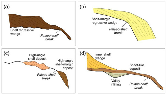 In contrast, in the northern shelves the combination of abundant minor rivers (Table 3 and Table 4) affected by the southward NC in the Barcelona Shelf would lead to a rather homogeneous shelf growth, mainly driven by thick prodeltaic deposits with restricted spatial distribution and infralittoral prograding wedges. Both types of deposits constitute the bulk of regressive wedges, whereas transgressive deposition is limited to sand sheets and/or retreating barriers and ridges [46,69], indicating that sediment flux would have been continued, although diminished, during rising sea-level conditions [8]. North of the Barcelona Shelf, the occurrence of shelf-indenting canyons may promote specific sediment supply conditions. For example, the combined contribution of several rivers would lead to a significant shelf growth in the Roses Shelf.