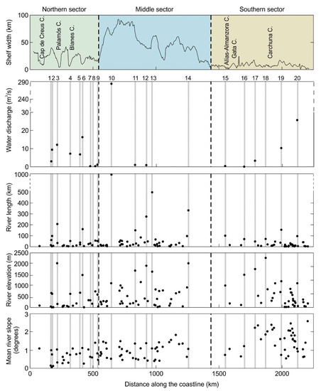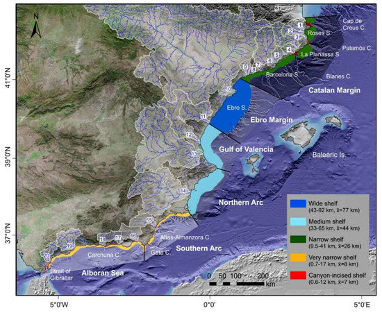 - Bathymetric data covering the continental margins along the Mediterranean side of the Iberian Peninsula were extracted from the EMODNET portal (http://www.emodnet-bathymetry.eu) and from the Catalano-Balearic Sea bathymetric chart build from several oceanographic surveys [38] (Figure 1). From the bathymetric databases, 200 m resolution bathymetric grids have been generated. Based on these data, the shelf width, measured from the shoreline to the shelf edge, was calculated every 2 km along the Mediterranean continental margin using ArcGIS© Desktop v. 10.3 (ESRI, Redlands, CA, USA). Several physiographic sectors have been defined along the studied margin based on the shelf width: wide shelf, medium shelf, narrow shelf, very narrow shelf, and canyon-incised shelf.