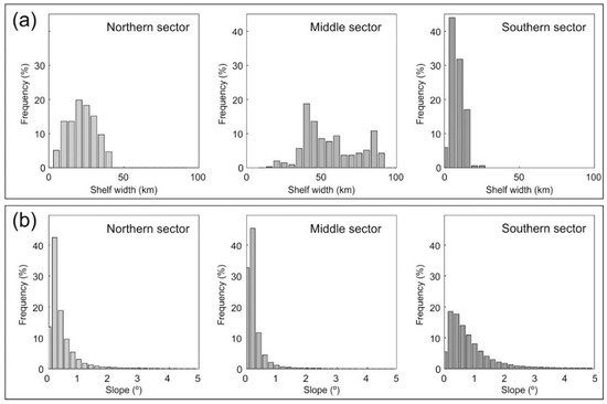 - The middle sector comprises the Ebro Shelf, the Gulf of Valencia, and the Northern Arc. The Ebro Shelf width ranges between 43 and 92 km, with a mean width of 77 km (Figure 3 and Figure 4a). To the south, both the Gulf of Valencia and the Northern Arc contain moderately wide shelves, ranging between 33 and 65 km and averaging 44 km; the only exception is the narrower shelf off Cape La Nao (up to 33 km). The seafloor gradient is markedly homogeneous (0.25° on average), particularly in the Ebro Shelf (Figure 4b).