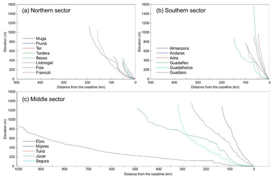River profiles of each sector of the Iberian Mediterranean shelves. Note the increasing slope of the studied rivers in the southern shelves. See Figure 3 for location.