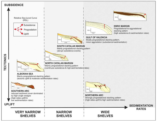 The amount of sediment supply combined with the tectono-physiographic setting may be used to establish different end-member margin scenarios, as documented for the Italian shelves [74,75]. Overall, the Iberian Mediterranean shelves can be regarded as sediment-fed, as they are mainly influenced by fluvial supplies of different significances. However, long-term building styles enable the distinguishing of a well-defined shelf gradation as a result of the combination of different conditions of sediment supply and uplift-subsidence regime: wide shelf (middle sector), narrow shelf (northern sector), and very narrow shelf (southern sector) (Figure 15).