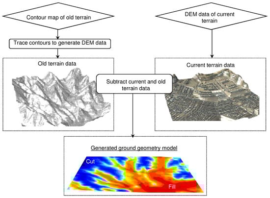 Generation of ground geometry model. Old terrain data before cut/fill of ground given as a contour map that was traced to make a digital elevation map (DEM). This was subtracted from a DEM of the current terrain to make a ground geometry model. Red in the generated ground geometry model indicate fill regions, while blue in the ground geometry model indicate cut regions.