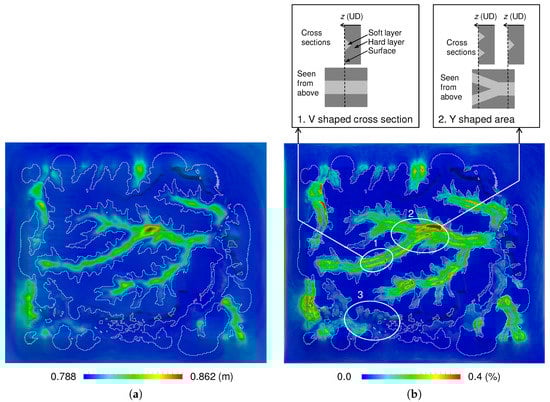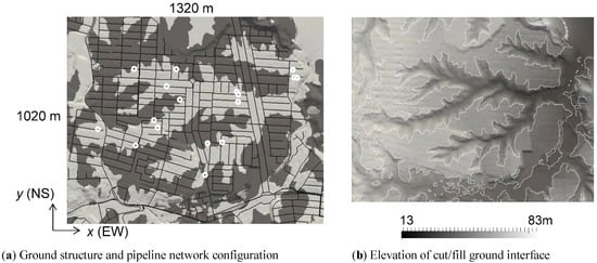 Target area. (a) Dark gray areas indicate cut ground (hard), while light gray areas indicate fill ground (soft). Black lines indicate position of pipeline. Here, pipeline is buried 1.2 m below the surface. Circles indicate the position of pipeline damage during the 2011 Tohoku Earthquake. (b) Elevation of cut/fill-layer interface. White lines indicate the cut/fill-layer interface.