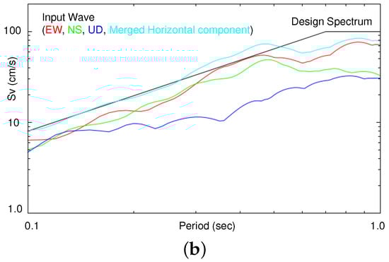 Figure 3 shows the generated 3D finite-element model. Here, 150 m buffer regions were added to the four sides of the 1320 × 1020 m (EW × NS) target area to avoid reflection waves that cannot be completely damped by the absorbing boundary conditions. As the non-uniformity of the ground is only near the surface, we modeled the region from a depth of −127 m to avoid reflection waves that cannot be completely damped by the absorbing boundary conditions at the bottom of the model. Modeling the domain with 2.5 m second-order tetrahedral finite elements leads to a finite-element model with 85,143,240 DOFs, 20,666,257 elements, and 28,381,080 nodes. The wave observed in the target area during the 2011 Tohoku earthquake (observation point S14, SAKR of Small Titan [27]) was pulled back to the bottom of the model (i.e., the wave at the bottom of the model is estimated based on 1D equivalent linear analysis) and input into the finite-element model to conduct nonlinear dynamic analysis. The wave was input as velocity and stress at the bottom and side boundaries of the model, and the waves that do not match with the 1D analysis results were damped by the absorbing boundary conditions. Here, we used a target frequency of = 2.5 Hz, = 0.1 Hz to set the Rayleigh damping parameters. Figure 4 shows the input wave. Here, the velocity response spectrum of the level-2 design wave used for the seismic design of water-distribution pipelines is shown together. It can be seen that the merged horizontal component (i.e., ) of the input wave has similar magnitude to that of the design spectrum. Computation of 300 s of analysis ( s × 300,000 time steps) took 46,993 s (13 h 03 min) using 512 compute nodes of the K computer [28].