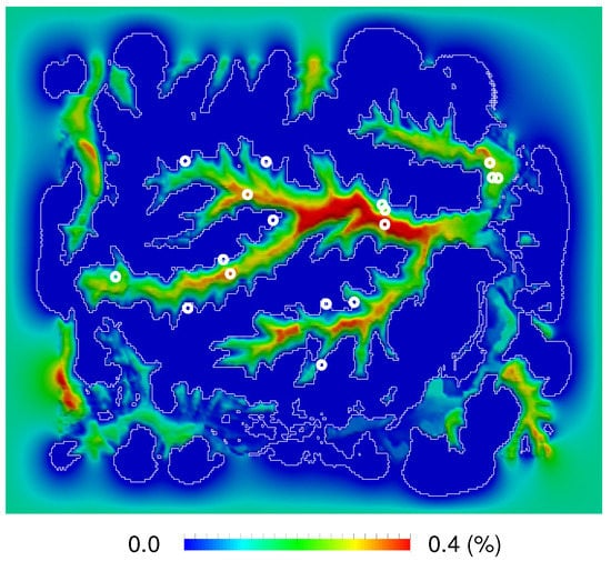 Design strain for level-2 ground motion (factor for all regions). White circles indicate the positions of pipeline damage.