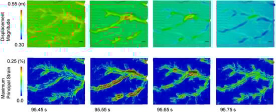Equation (6) is multiplied by coefficient to reflect the complexity of the ground at the target site, and the pipelines are designed to withstand this strain level ( is set to 1.2 for complexly shaped ground sites and 1.0 elsewhere). Because the input wave in this study corresponds to a level-2 wave, the difference between the design strain and the actual strain that can happen for a large earthquake can be estimated by comparing the computed strain-response distribution. Figure 6 shows the strain estimated by the design method ( is used for the whole domain). When compared with the computed strain in Figure 5b, similarities such as the strain becoming larger in the fill regions can be seen. Also apparent is the fact that the maximum strain-response amplitude is similar between the two methods. However, the distribution inside the fill region differs locally in some places. For example, the strain tends to be large at the center of V-shaped fill areas for the design strain, which differs from that observed in the 1978 earthquake and that computed by the 3D analysis. The reason for such a difference can be found by seeing the time history displacement and strain distribution of the 3D analysis as shown in Figure 7. As seen in the top row of Figure 7, the displacement is amplified at the fill regions, and the displacement response thus differs between the cut regions and the fill regions. This difference in displacement response causes a large strain in regions slightly within the fill region from the cut/fill interface (bottom row of Figure 7). The large strain occurs in regions slightly within the fill region from the cut/fill interface for all of the four time steps shown. On the other hand, as the velocity response spectrum of the design wave increases monotonically with the natural period (Figure 4), the estimated strain also increases monotonically with the fill-layer depth. Thus, it can be seen that the design method is sufficient for estimating the maximum magnitude of the strain response in a given area, but it may not be as accurate when predicting the position of the maximum strain response. Thus, depending on the setting of , the centers of the V-shaped fill domains may have excessive design strength or the edges of such domain may lack design strength. Indeed, much of the pipeline damage indicated with circles in Figure 6 occurred near the edges of the fill regions, which corresponds better with the 3D analysis results.