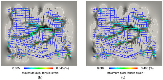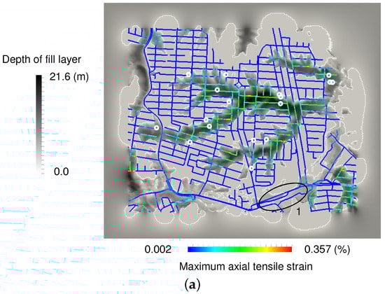 Although peak ground velocity or peak ground acceleration are typically used for indices in repair rate curves of pipelines [31,32,33,34], pipeline damage is pointed out to be due to the deformation and strain of pipes [4]. By using the developed 3D ground analysis method, we can directly compute ground strain; thus, we use strain as an index for damage assessment of pipelines. Because 12 out of the 17 instances of damage in the target area were due to dislocation at pipe joints, we consider the axial strain of the pipes, which is correlated with pipe-joint dislocation. Figure 8a shows the axial strain at the underground pipeline position. Here, axial strain is computed as the ground strain component in the axial direction of the pipe at the pipeline position. Compared with Figure 5b, the distribution of axial strain at the pipeline network is similar to the maximum principal strain at the surface. Thus, it can be seen that the strain distribution at the surface can be used to estimate the subsurface ground strain at the pipeline network. Because water-distribution pipelines are designed to withstand a strain of 0.004 in this area [30], the computed maximum axial strain (0.00357) is large enough for damage to occur, given the effects of long-term aging. When comparing the pipeline strain distribution with that of the damage in Figure 8a, the locations of maximum strain do not necessarily match those of the damage. However, there appears to be no damage in the cut areas. In addition, the damage is not uniform inside the fill areas; parts of the fill areas with small computed strain were not damaged (e.g., area 1 in Figure 8a). Although we can tune the ground geometry or material properties such that the estimated strain distribution becomes closer to the actual pipeline damage distribution, we can see that the results even without tuning of ground geometry and material properties could be used to screen for areas with possible damage (i.e., identify areas that have low probability of damage).