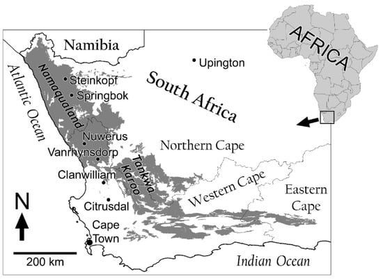 - Francis, M.L.; Fey, M.V.; Prinsloo, H.P.; Ellis, F.; Mills, A.J.; Medinski, T.V. Soils of Namaqualand: Compensations for aridity. J. Arid Environ. 2007, 70, 588–603. [Google Scholar] [CrossRef]