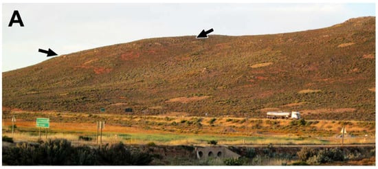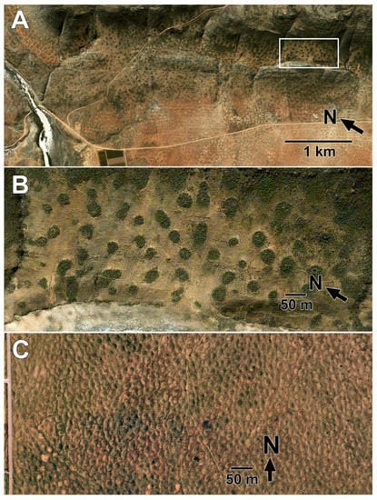 Some investigators have sought to identify similarities of processes that could be responsible for producing mounds in different parts of the globe, including heuweltjies [39,40,41]. Although the heuweltjies and Mima-type mounds share some features, including evidence from a site in the south-central USA for an aeolian sediment component [42], substantial contrasts exist that suggest differing developmental pathways and origins. Johnson and Johnson [43] provide evidence for the operation of a complex set of mechanisms including bioturbation, seasonal frost heaving, erosional processes, and occasional aeolian inputs in forming mounds in cooler, high-elevation sites with thin, clay-rich soils above basalt flows. Although the Mima-type mounds at sites in North America commonly tend to be regularly spaced (e.g., Figure 2C; [44,45]), they are typically smaller in diameter and much more closely spaced than are heuweltjies (Figure 2B,C). Nevertheless, the strong tendency for regular spacing in both Mima-type mounds and heuweltjies could similarly be influenced by interactions among animals occupying and contributing in some way to the formation of those mounds.