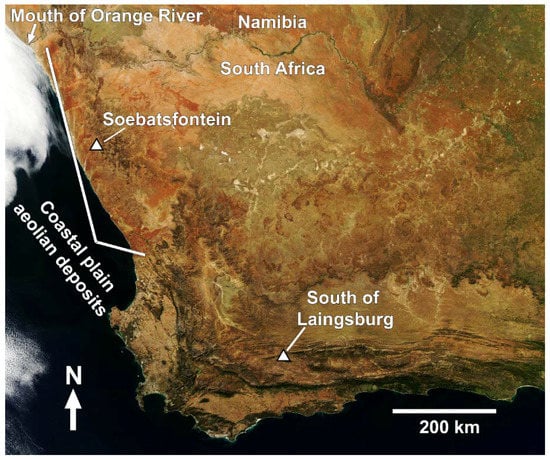 Satellite view of western portion of South Africa (same area as map in Figure 1). The red-hued areas along the coastal plain are old (mainly Pleistocene) dune deposits reddened by pedogenic alteration over time. The Soebatsfontein site is within the area covered to variable extent by those aeolian sand deposits. The South of Laingsburg site, in contrast, is located in an inland, narrow intermontane basin lacking such regionally extensive, fine-grained sediments that can be mobilized by the wind. Sizes of heuweltjies at these two sites and several others were compared in McAuliffe et al. [19].