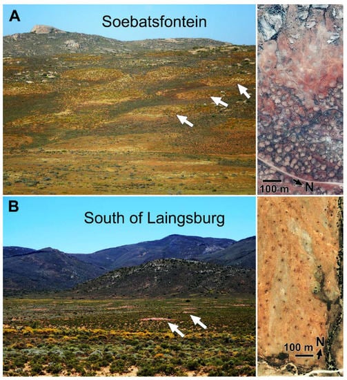 One of the more unusual and enigmatic characteristics of the succulent Karoo is the widespread dotting of the landscape with regularly spaced, earthen mounds called heuweltjies (pronounced “hue-vil-kees”). These mounds occur over an area of approximately 67,000 km2 in Western South Africa (the distribution of heuweltjies is mapped in [2]) and occupy a quarter of the land surface in some places (Figure 2A,B). The mounds typically range in height from a few decimeters to slightly more than 2 m and in diameter from less than 10 m to somewhat more than 30 m (Figure 3A). They occur on many kinds of geological substrates, including various sedimentary, metamorphic, and igneous rocks, as well as older (Pleistocene) aeolian dune and alluvial deposits. They also occupy a range of topographic settings, including nearly level valley floors and gentle to moderately steep hillslopes, but are absent from the steepest mountain slopes. Although superficially similar to the much-studied Mima mounds of the Western United States, heuweltjies are typically spaced much further apart from one another (centre-to-centre nearest neighbour distances of 40–50 m) than the considerably lesser typical distance between adjacent Mima mounds (e.g., 10–20 m at the classic Mima Prairie site, Thurston County, Washington, USA; Figure 2B,C).
